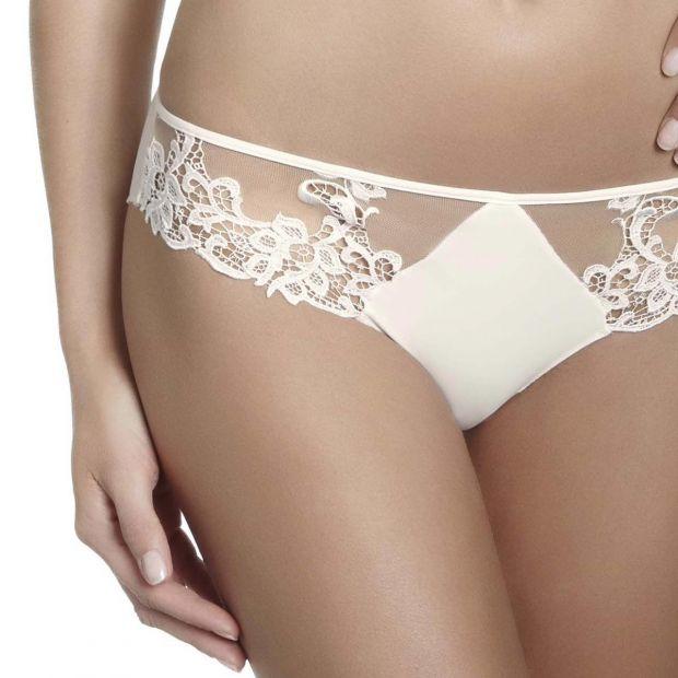 | Guipure-Spitze in fein ziselierter Ausprägung schmücken die vorderen Seiten dieses Slips. Der pure Tüll lässt die Ornamente besonders wirken. Einen hübschen Gegensatz dazu bildet der rhombenförmige Einsatz aus dünnem und blickdichten Mikrofasergewebe. Auch das Rückenteil besteht komplett aus diesem Material, die Ränder sind flach abgekettelt. An der Taille ist das elegante Höschen sehr fein versäumt. |